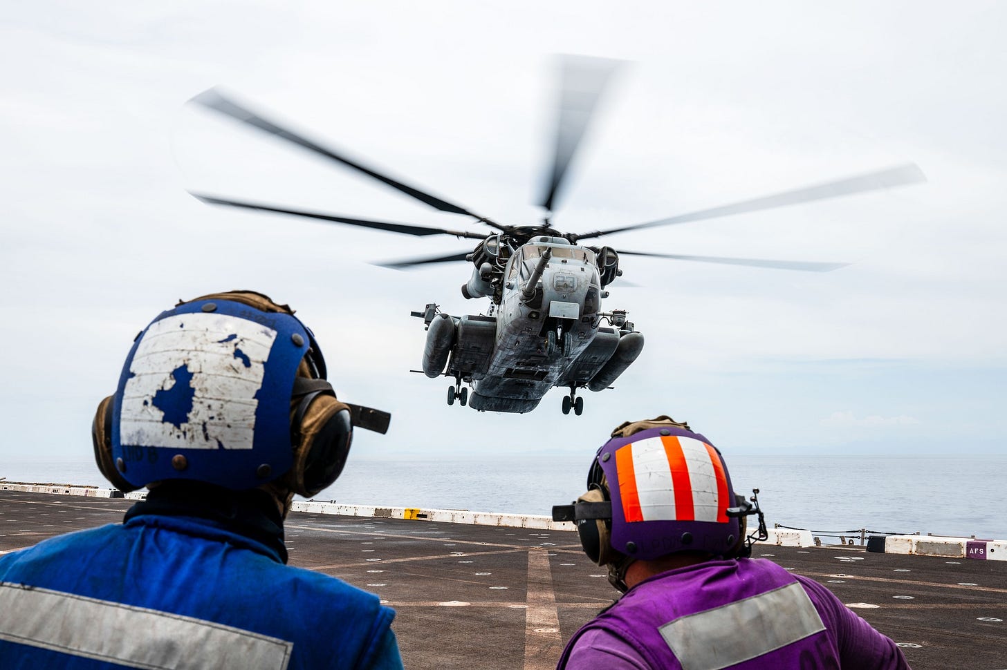 US Marines conduct flight deck operations aboard the amphibius assault ship USS Somerset (LPD 25) during Balikatan last May 1, 2024, at South China Sea. Photo by US Navy Mass Communication Specialist 2nd Class Evan Diaz.